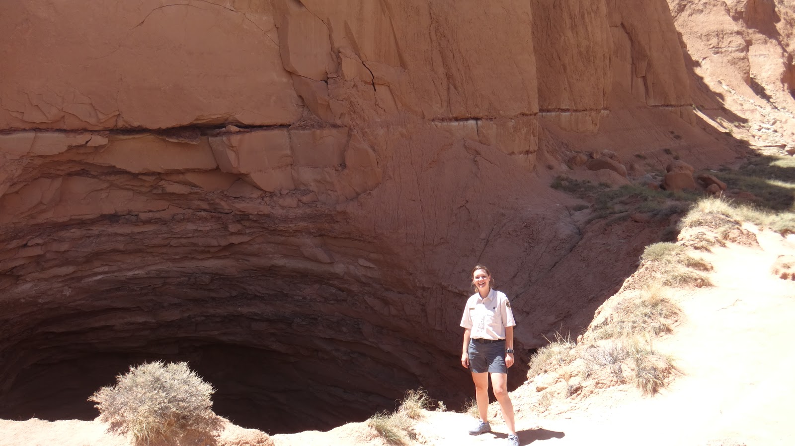 Dann wird es noch unglaublicher, wir erreichen das Gypsum Sinkhole, das Gips-Schlundloch. Als die Ozeane, die hier mal waren, ausgetrocknet sind, wurden viele Salze hinterlassen, die später durch Druck komprimiert wurden. Durch diesen Druck bildeten sich Gipsbetten, die wie eine Blase im Gestein lagen. Grundwasser hat dann den wasserlöslichen Gips weg gewaschen und zum kollabieren der darüber liegenden Schichten geführt. Das Loch ist 15 m breit und 61 m tief.